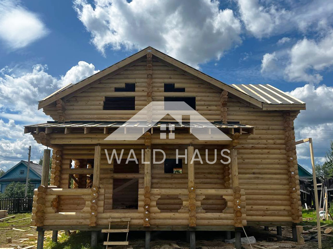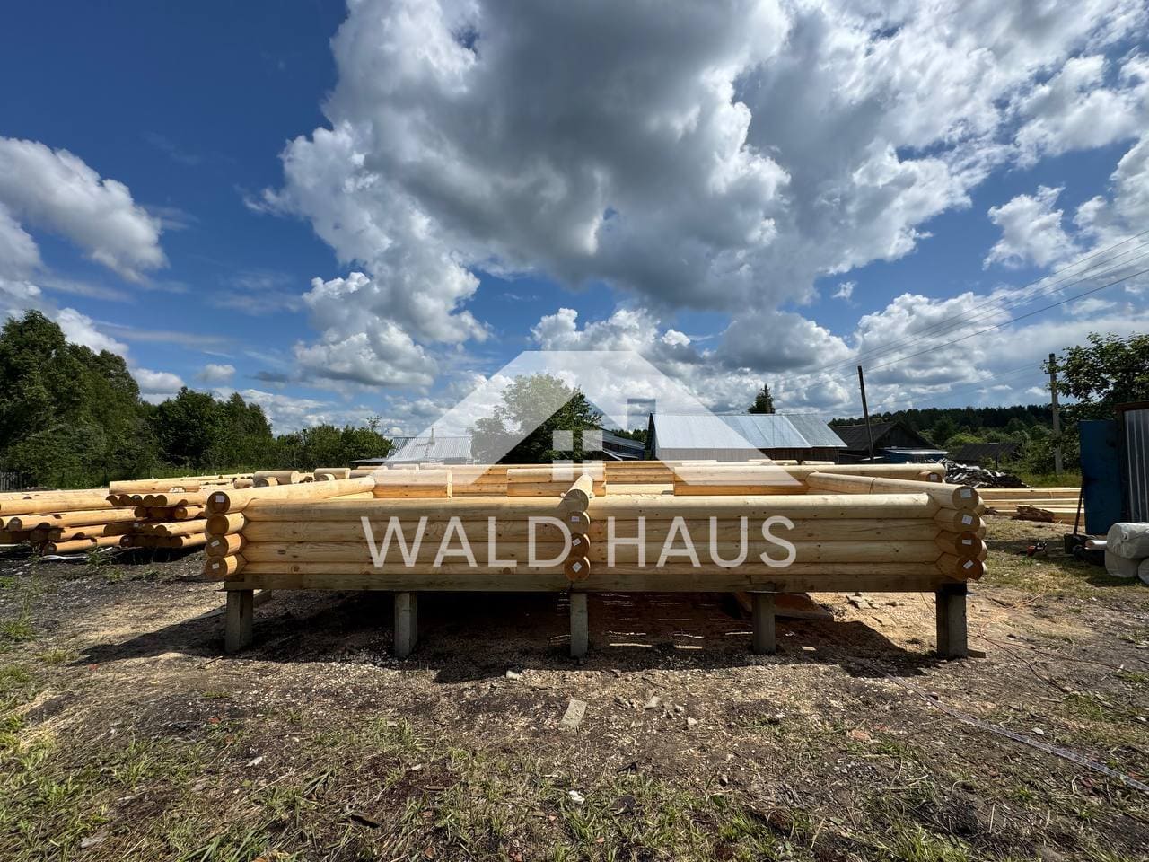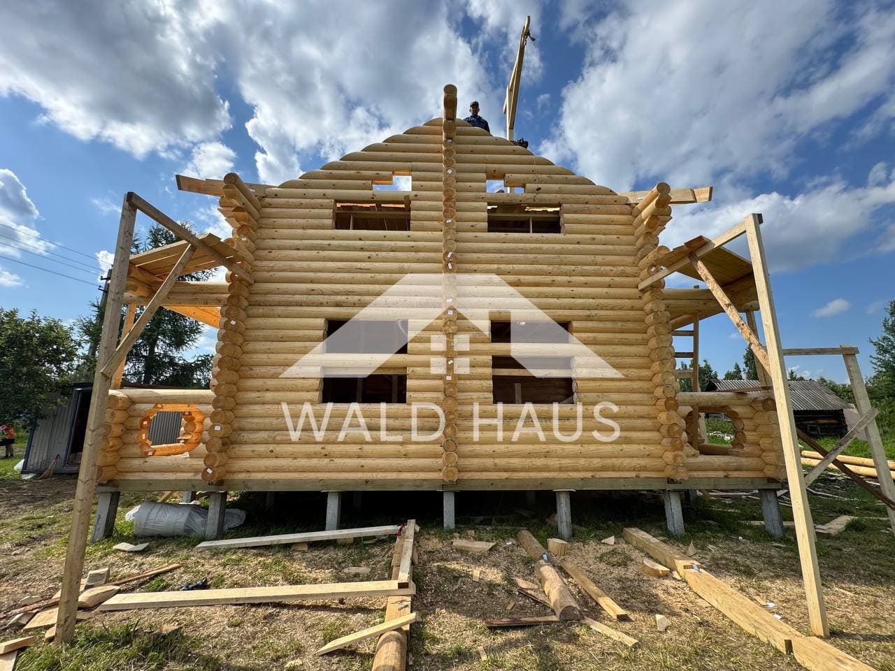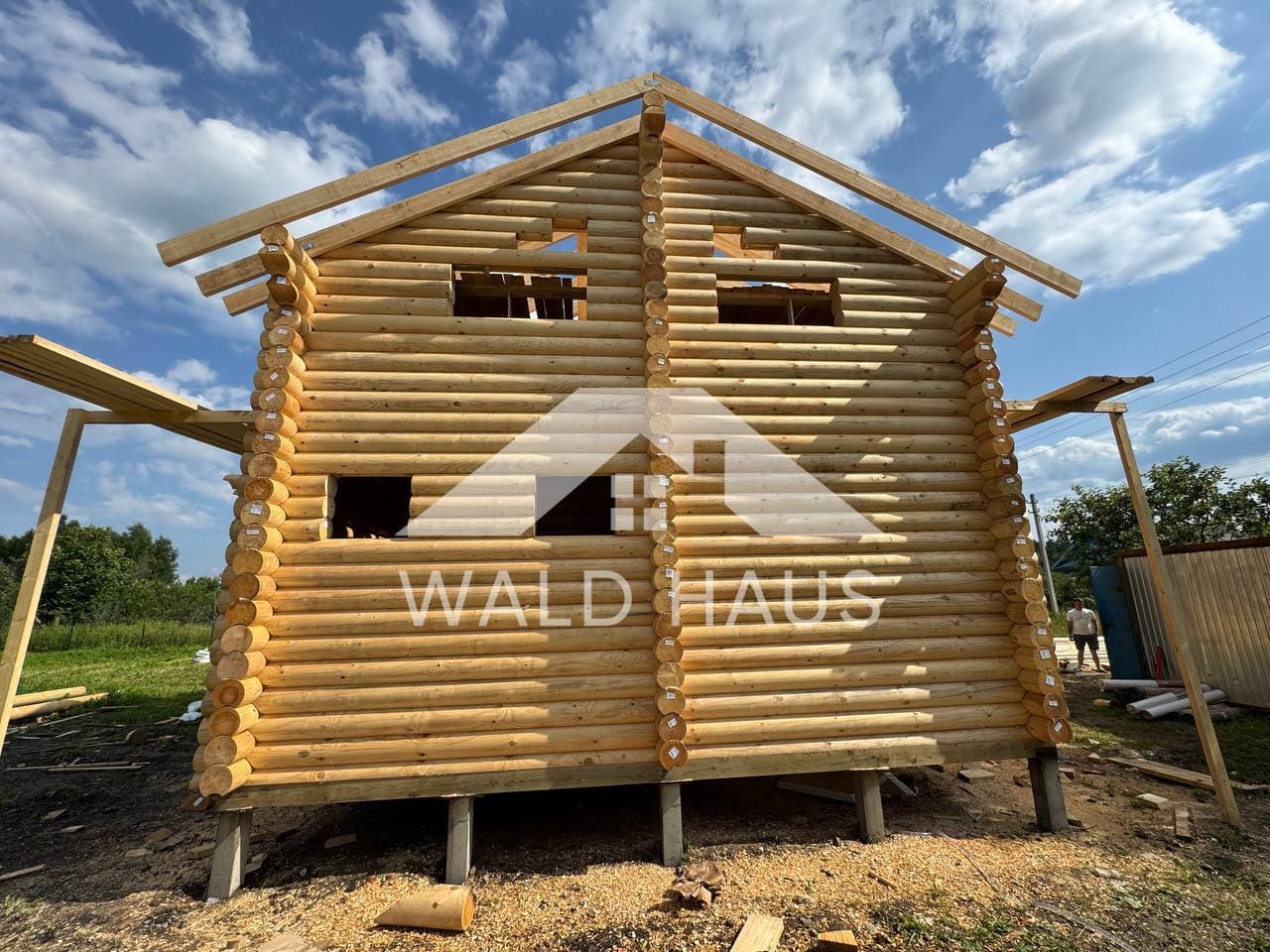 Дом построен под усадку: стопа из оцилиндрованного бревна 220мм с прокладкой джута между венцами и сборкой на березовые нагеля. Фундамент - железобетонные забивные сваи, покрытие кровли временное -рубероид. Внутренние работы, работы по монтажу окон и дверей, а также покраска и шлифовка сруба выполняются не ранее 6 месяцев после окончания работ.