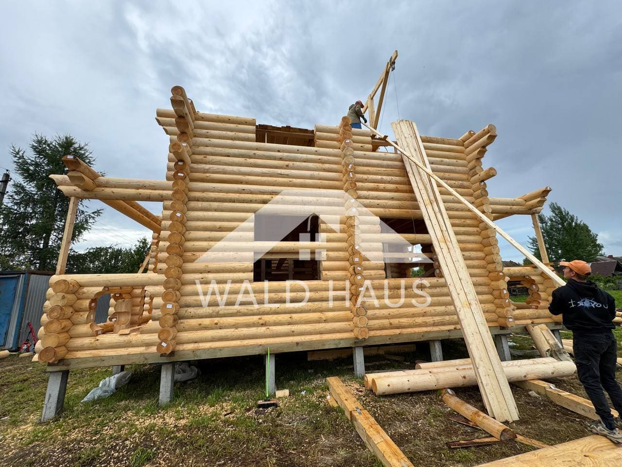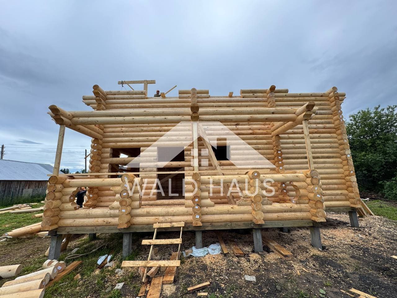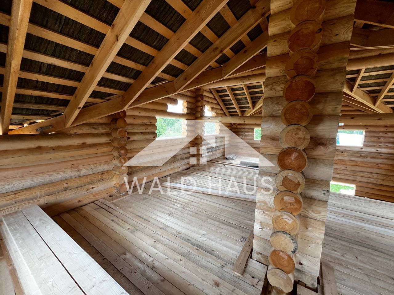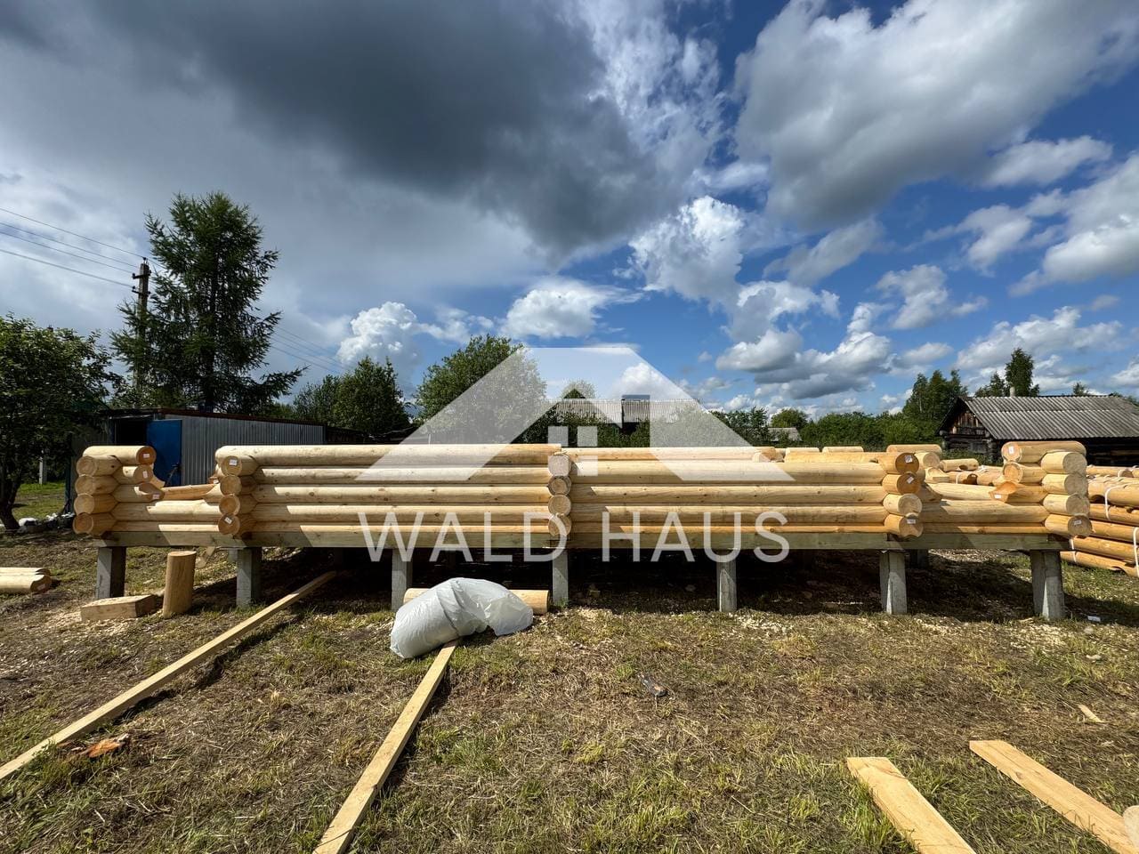 Дом построен под усадку: стопа из оцилиндрованного бревна 220мм с прокладкой джута между венцами и сборкой на березовые нагеля. Фундамент - железобетонные забивные сваи, покрытие кровли временное -рубероид. Внутренние работы, работы по монтажу окон и дверей, а также покраска и шлифовка сруба выполняются не ранее 6 месяцев после окончания работ.