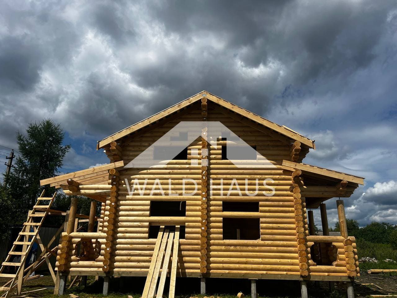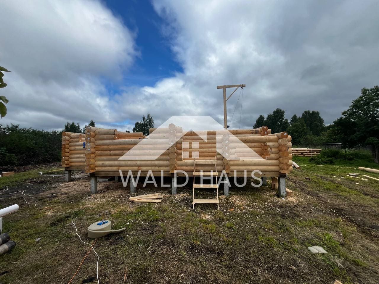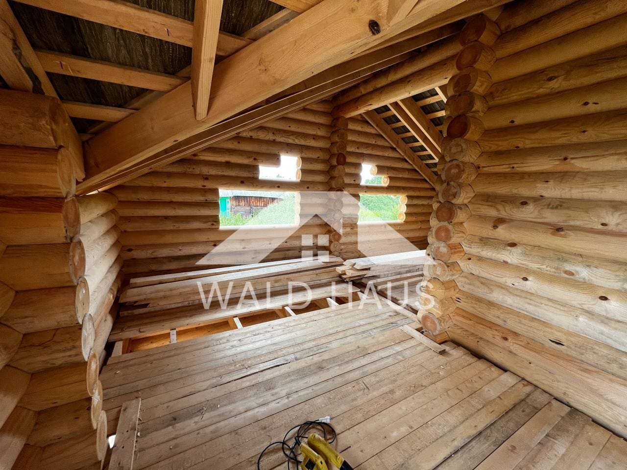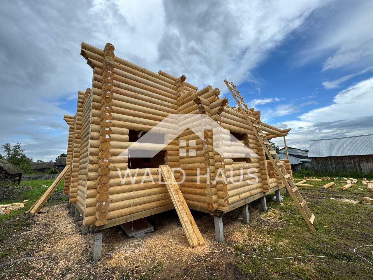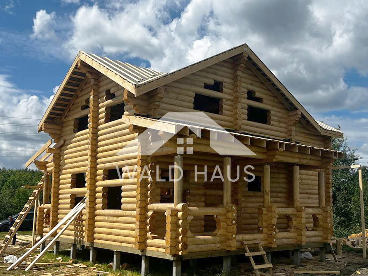 Дом построен под усадку: стопа из оцилиндрованного бревна 220мм с прокладкой джута между венцами и сборкой на березовые нагеля. Фундамент - железобетонные забивные сваи, покрытие кровли временное -рубероид. Внутренние работы, работы по монтажу окон и дверей, а также покраска и шлифовка сруба выполняются не ранее 6 месяцев после окончания работ.