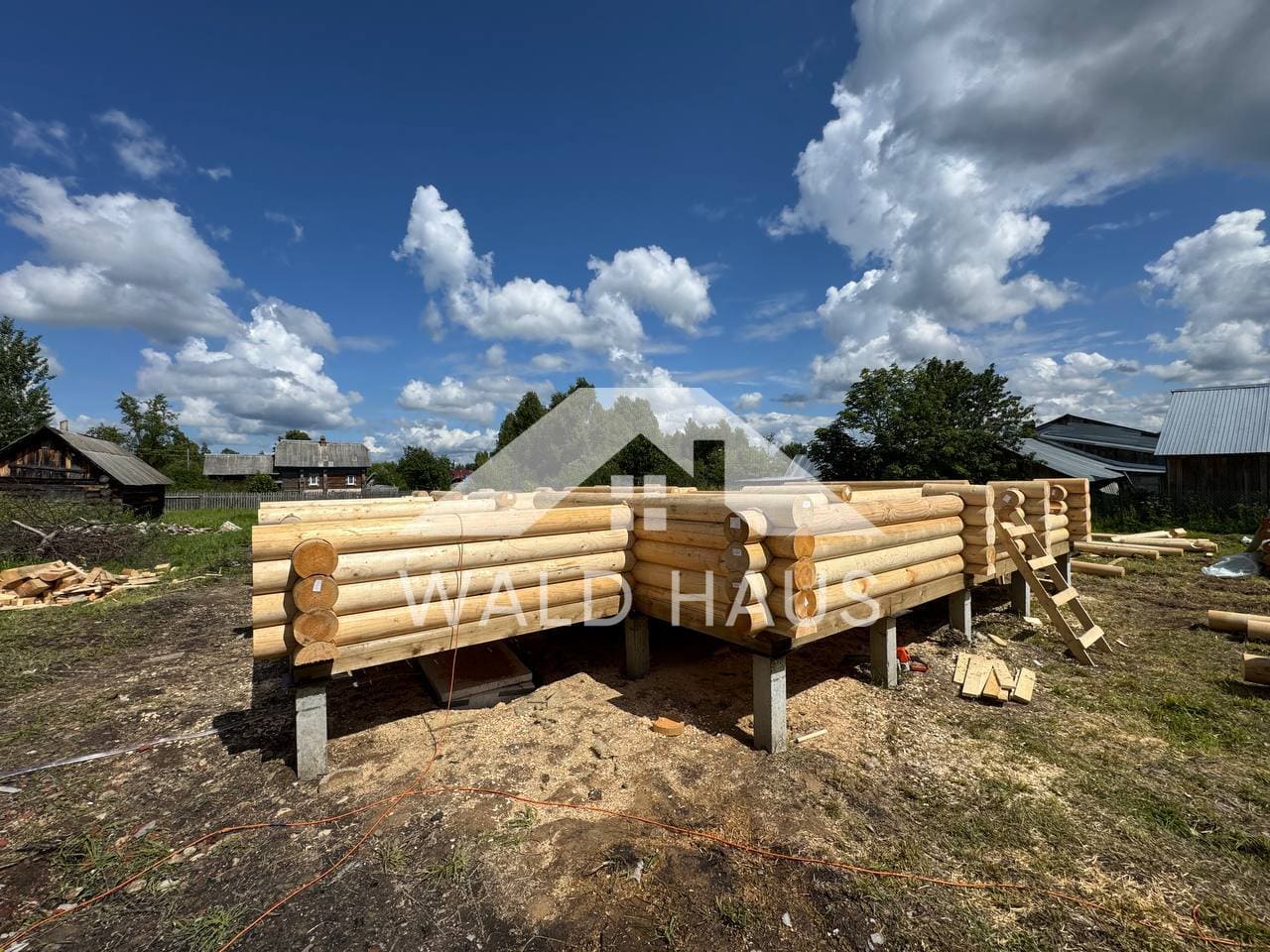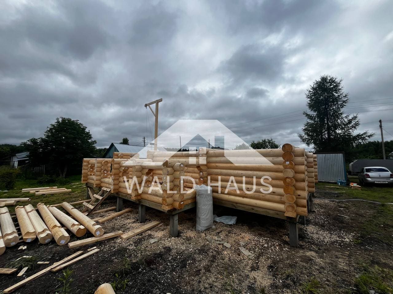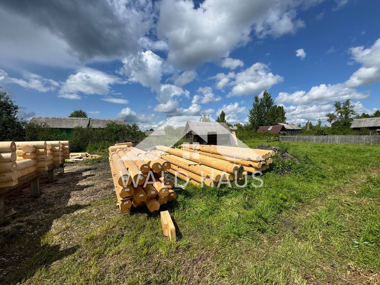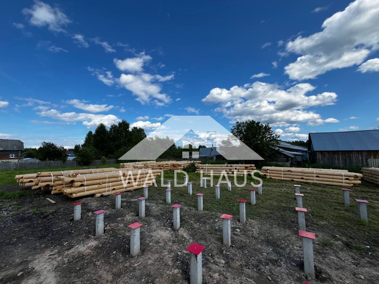 Дом построен под усадку: стопа из оцилиндрованного бревна 220мм с прокладкой джута между венцами и сборкой на березовые нагеля. Фундамент - железобетонные забивные сваи, покрытие кровли временное -рубероид. Внутренние работы, работы по монтажу окон и дверей, а также покраска и шлифовка сруба выполняются не ранее 6 месяцев после окончания работ.