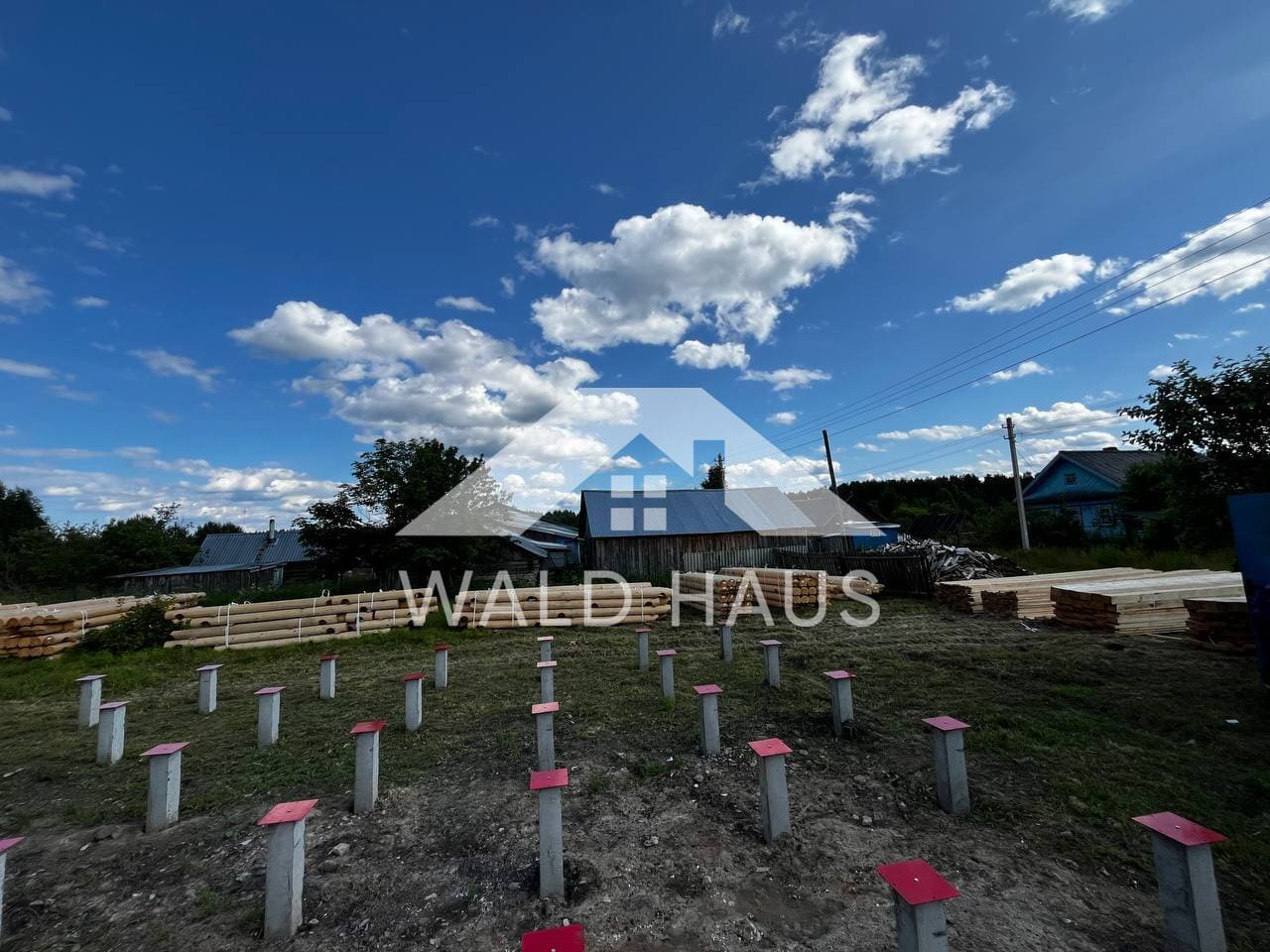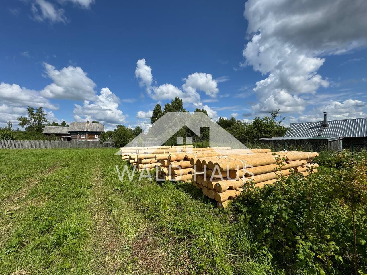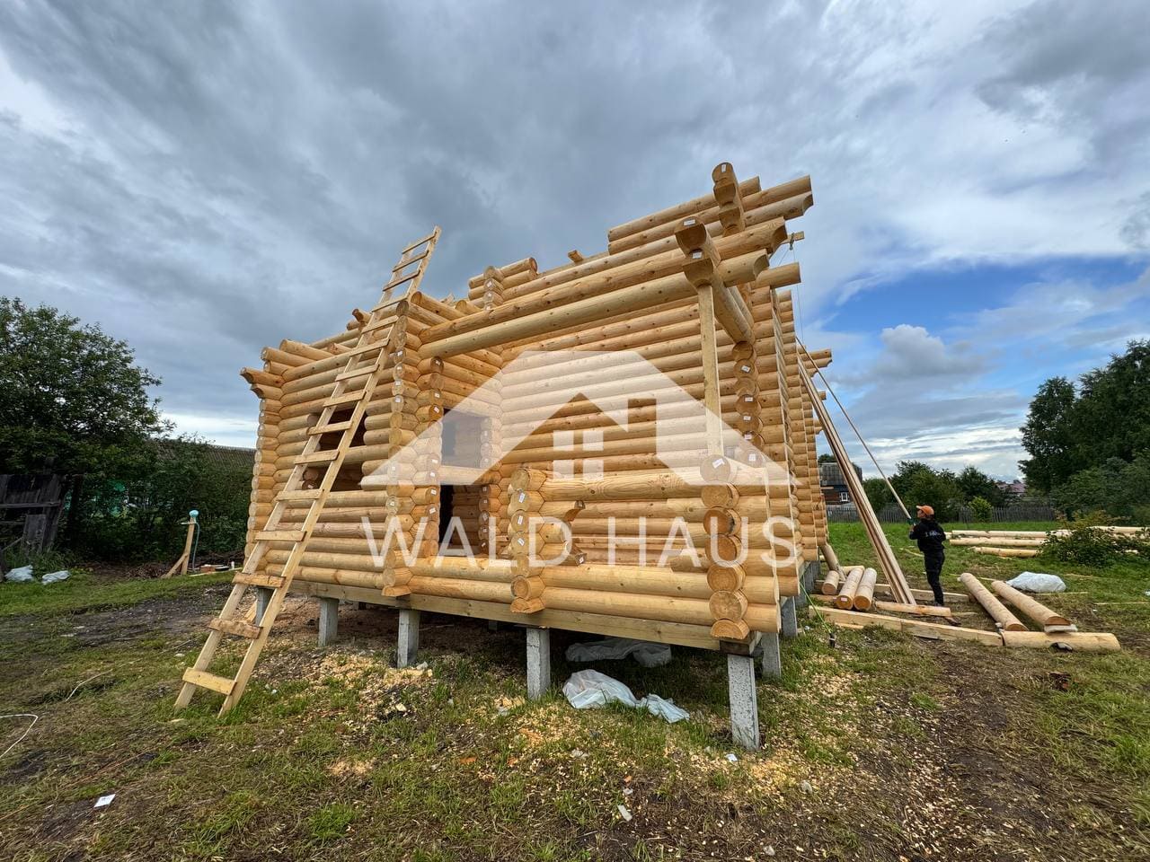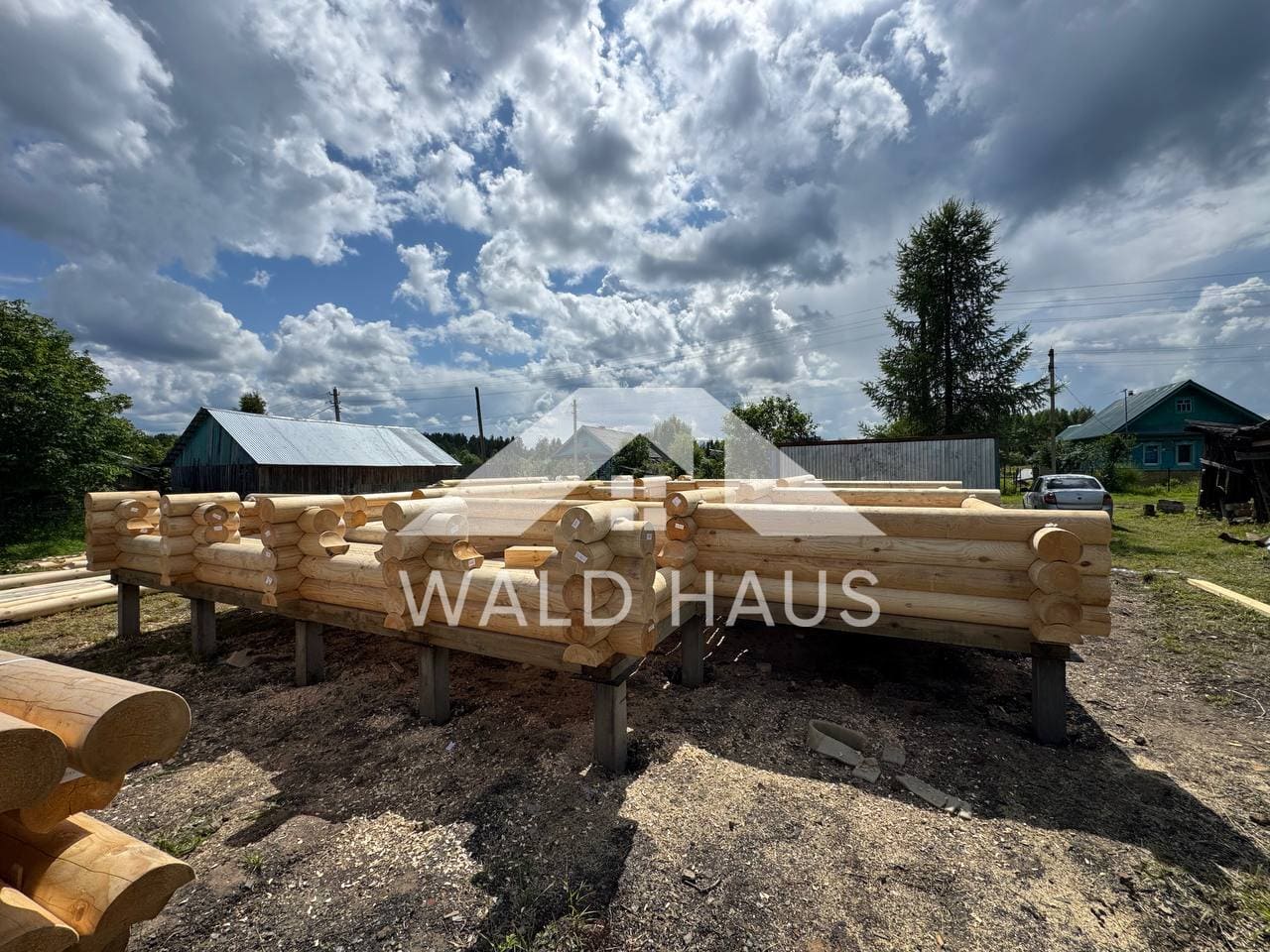 Дом построен под усадку: стопа из оцилиндрованного бревна 220мм с прокладкой джута между венцами и сборкой на березовые нагеля. Фундамент - железобетонные забивные сваи, покрытие кровли временное -рубероид. Внутренние работы, работы по монтажу окон и дверей, а также покраска и шлифовка сруба выполняются не ранее 6 месяцев после окончания работ.