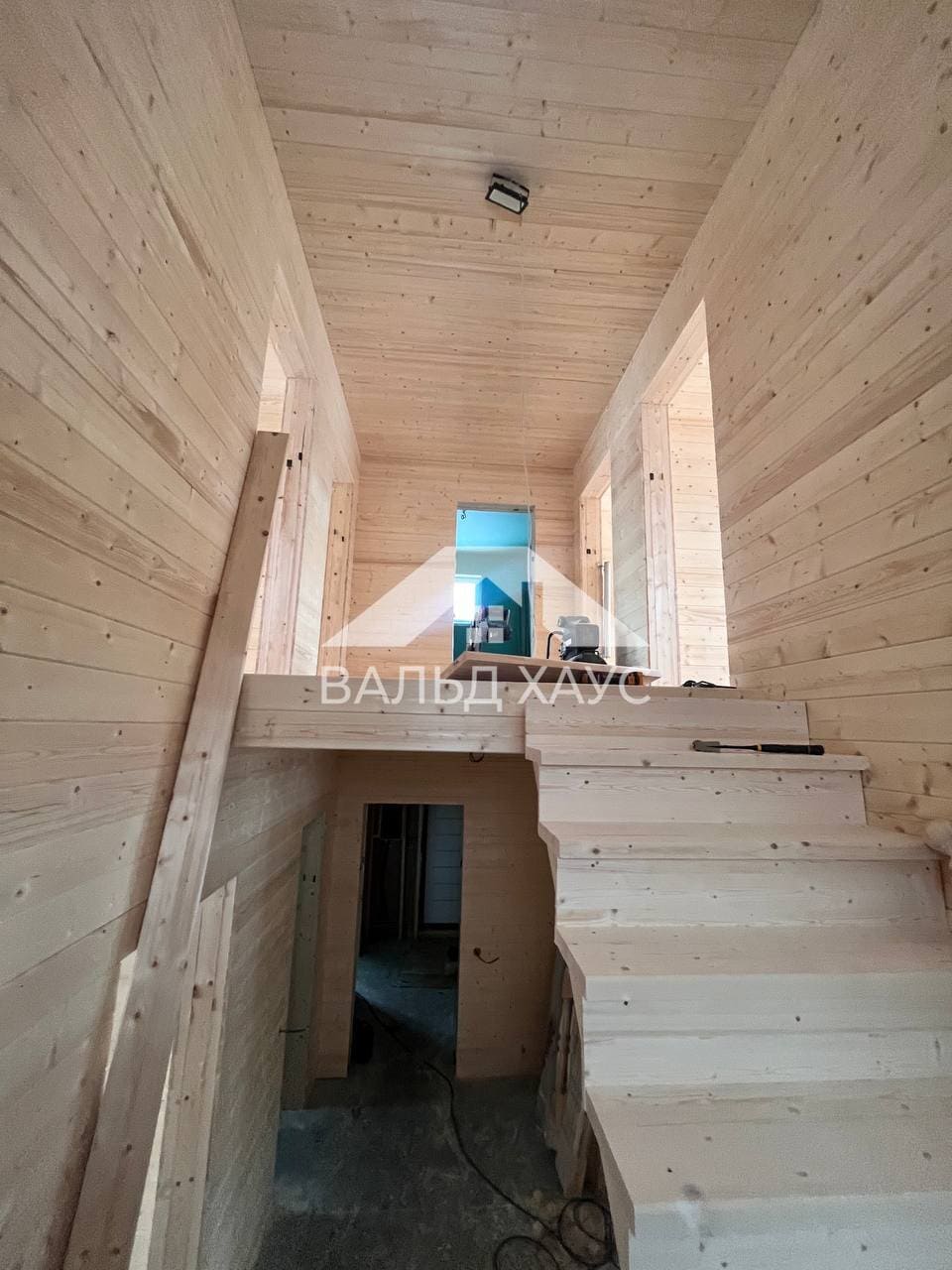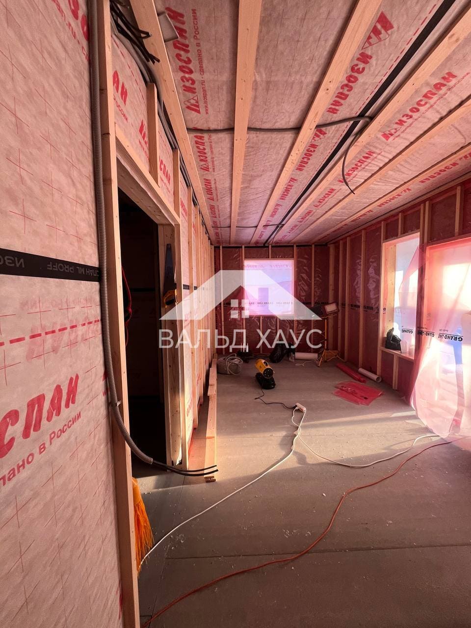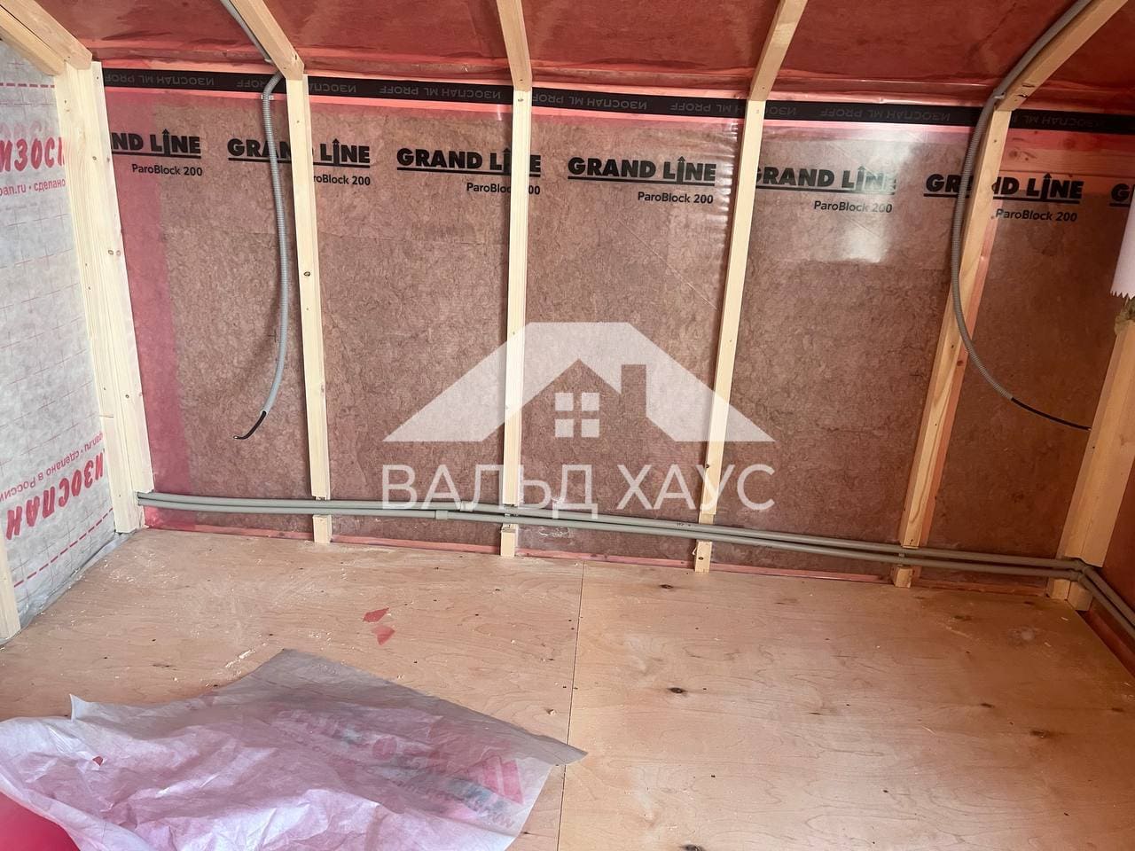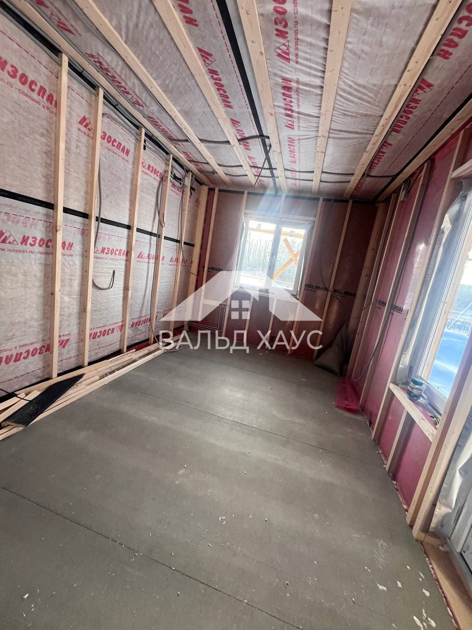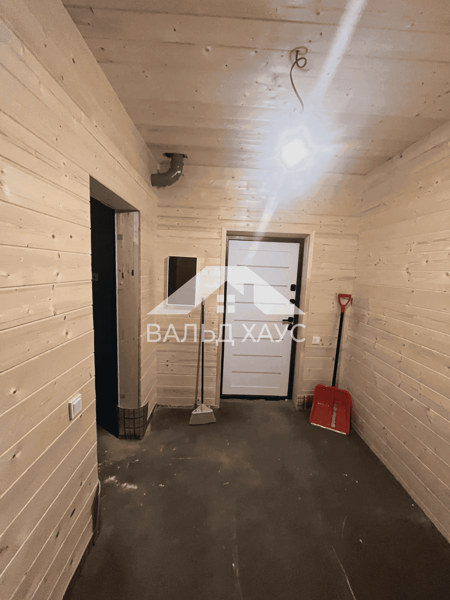 Внутренняя отделка выполнена из вагонки и гипрока в технических помещениях. Сделаны все коммуникации по дому, включая теплые полы и стяжку по первому этажу.