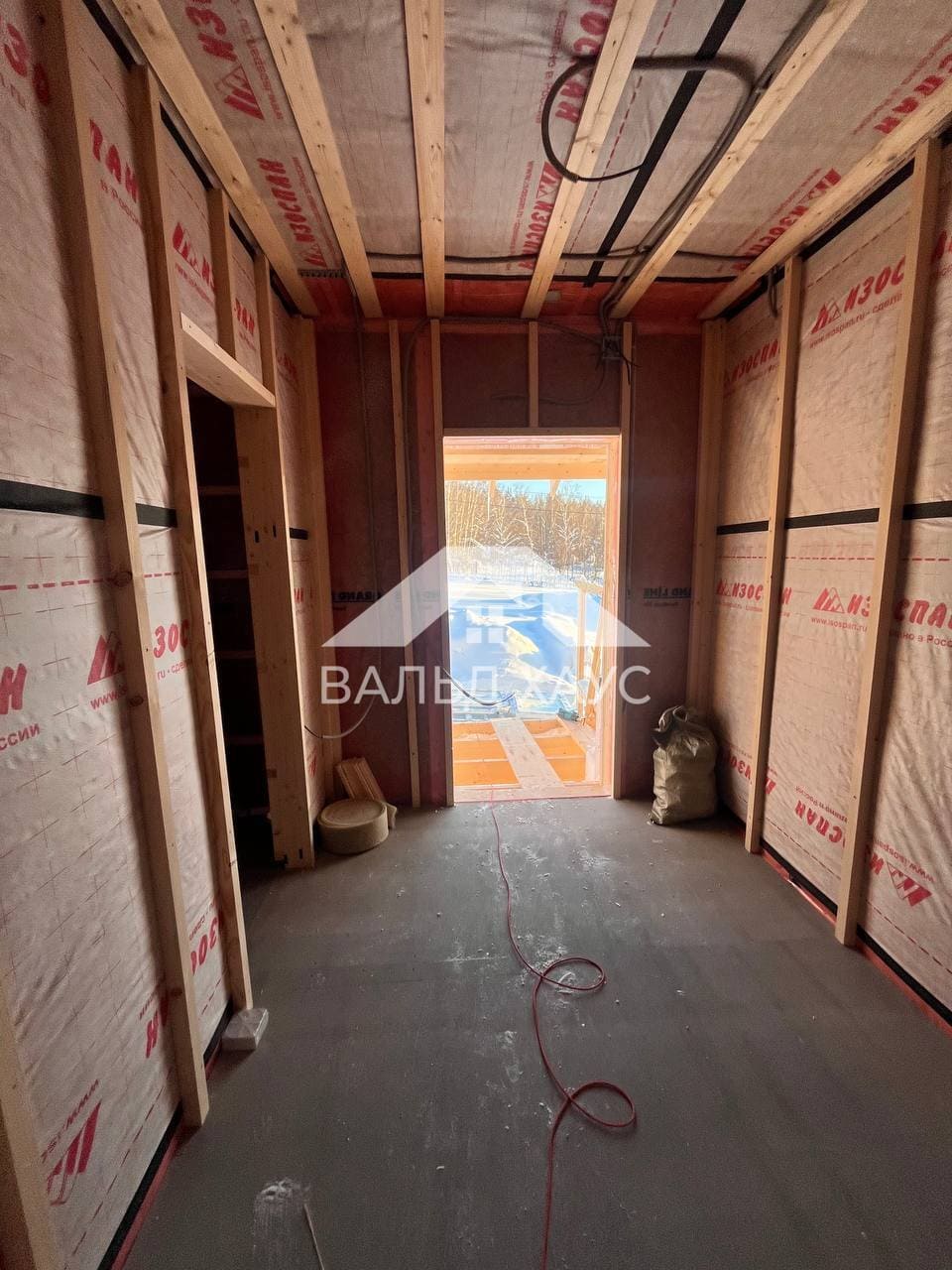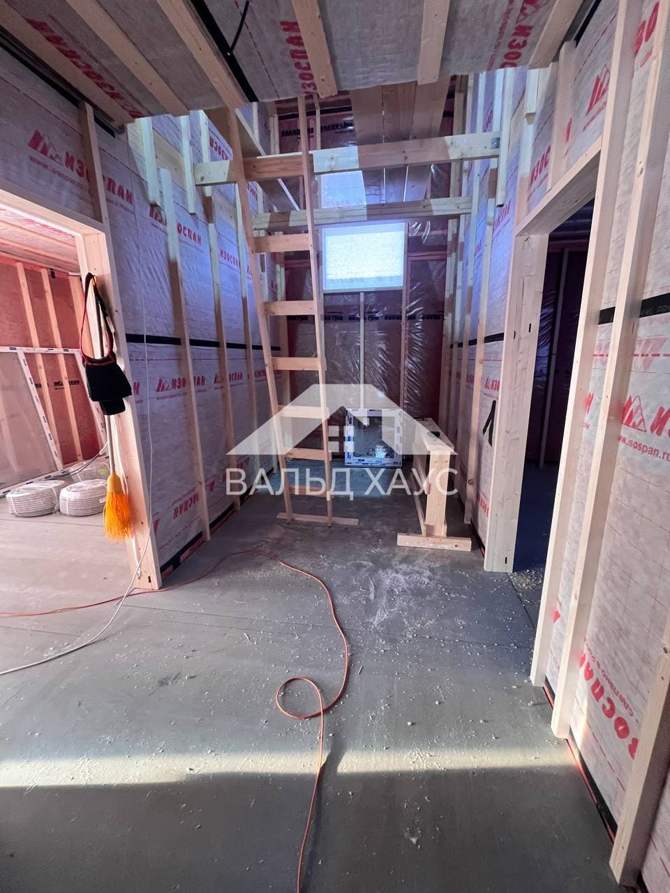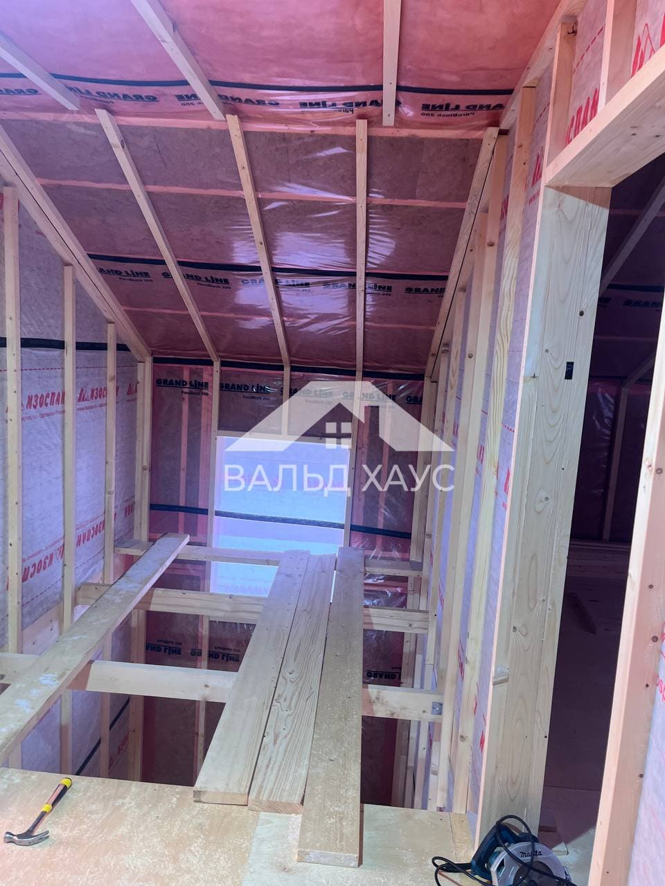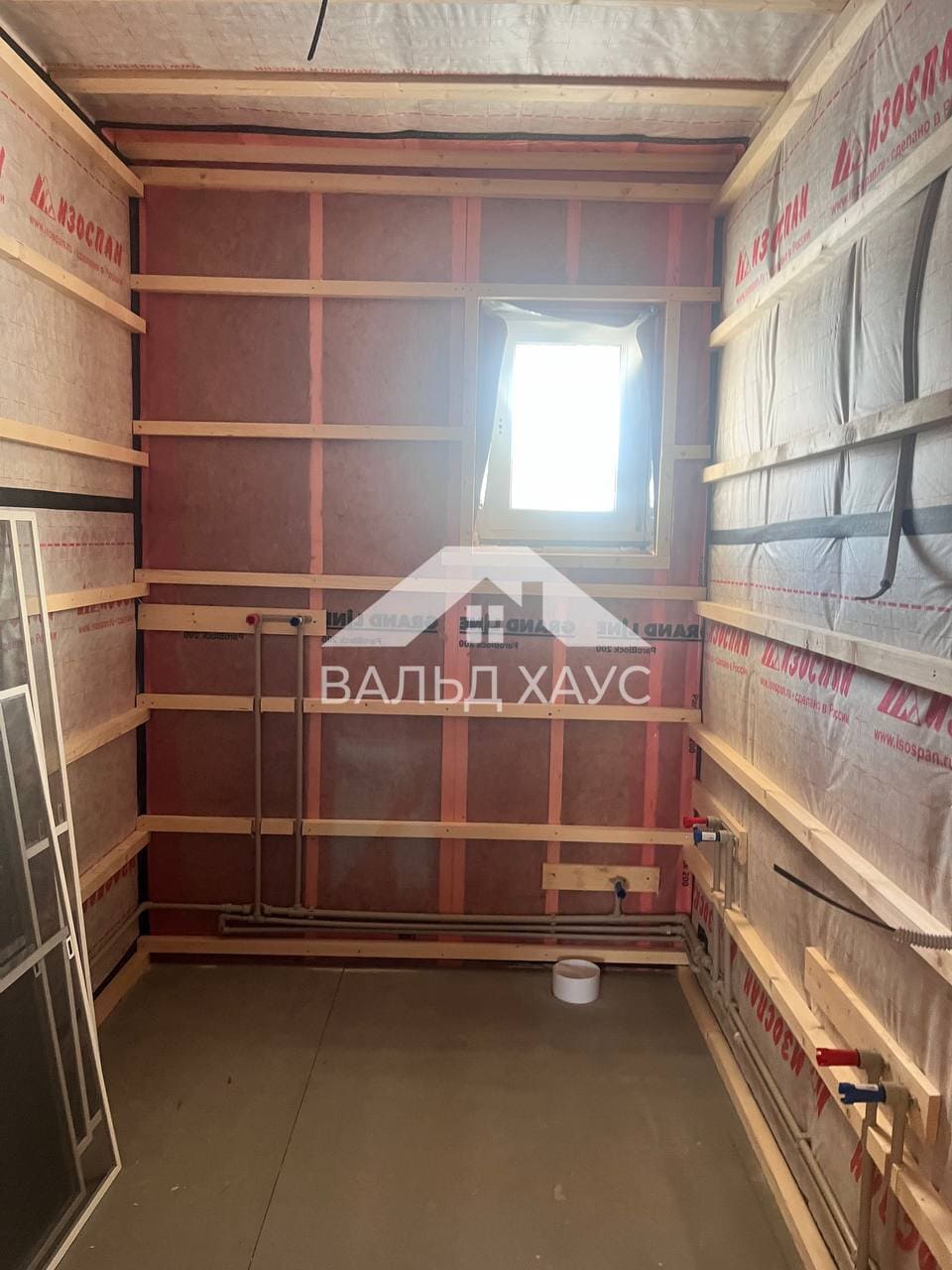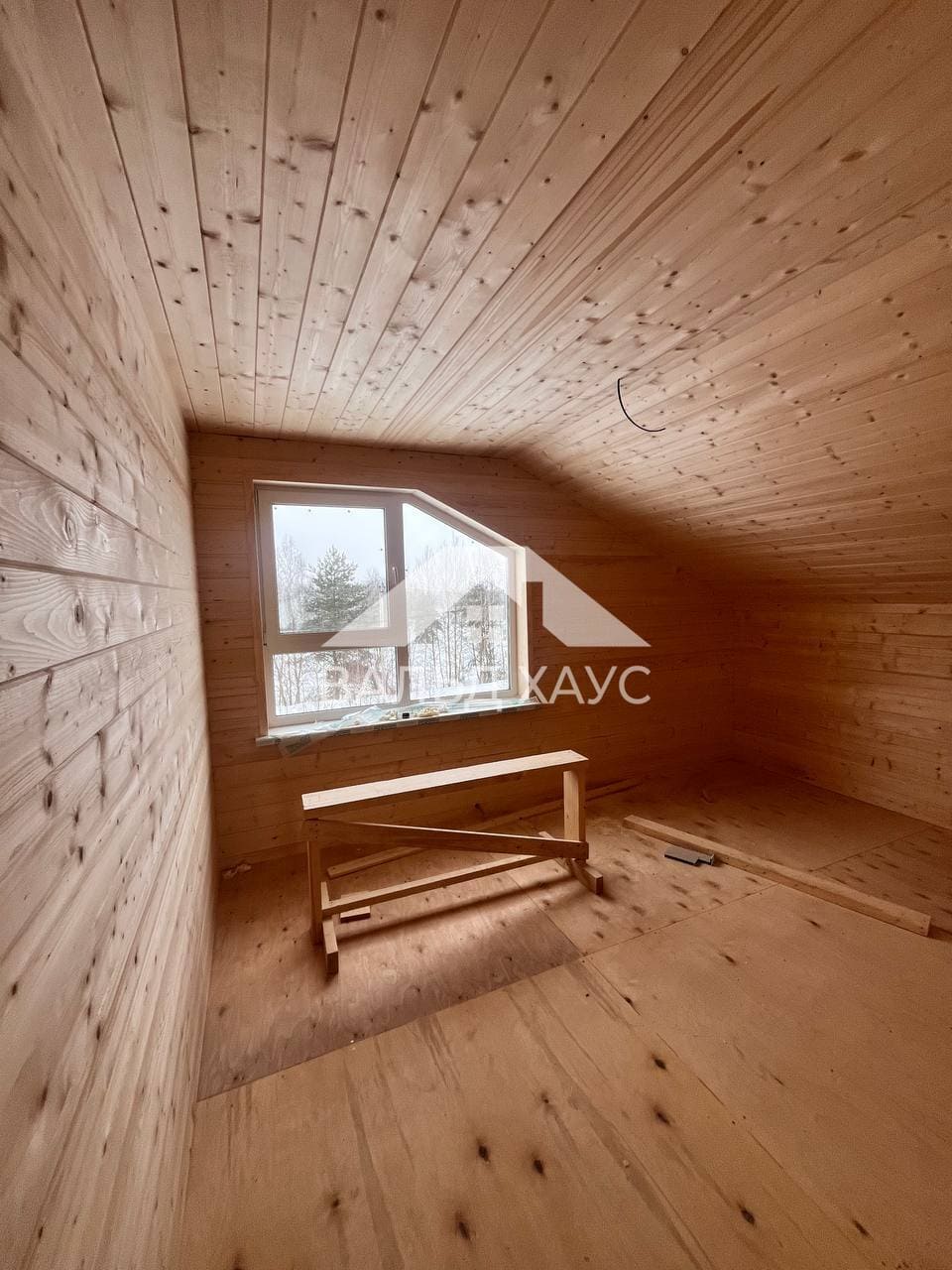 Внутренняя отделка выполнена из вагонки и гипрока в технических помещениях. Сделаны все коммуникации по дому, включая теплые полы и стяжку по первому этажу.
