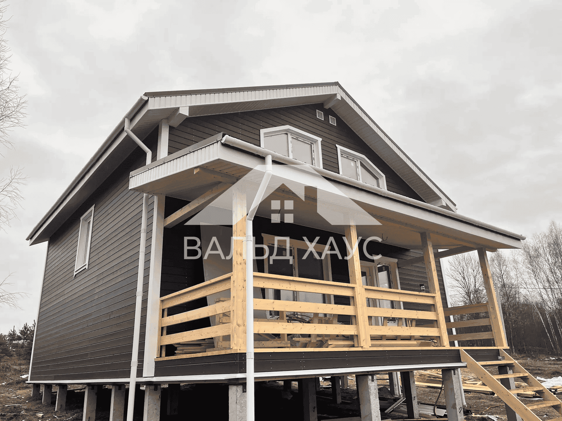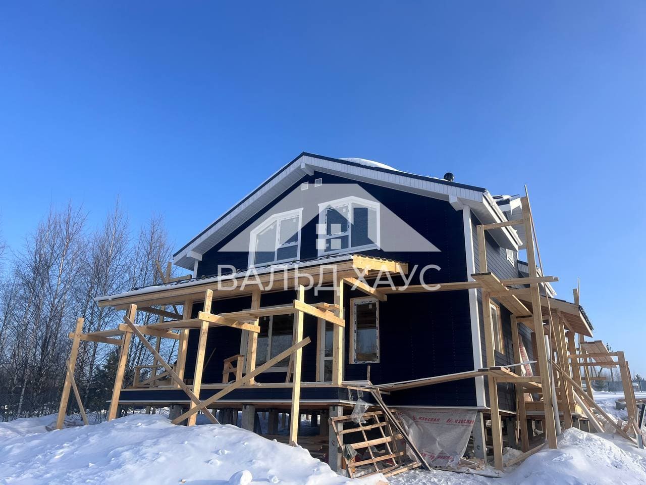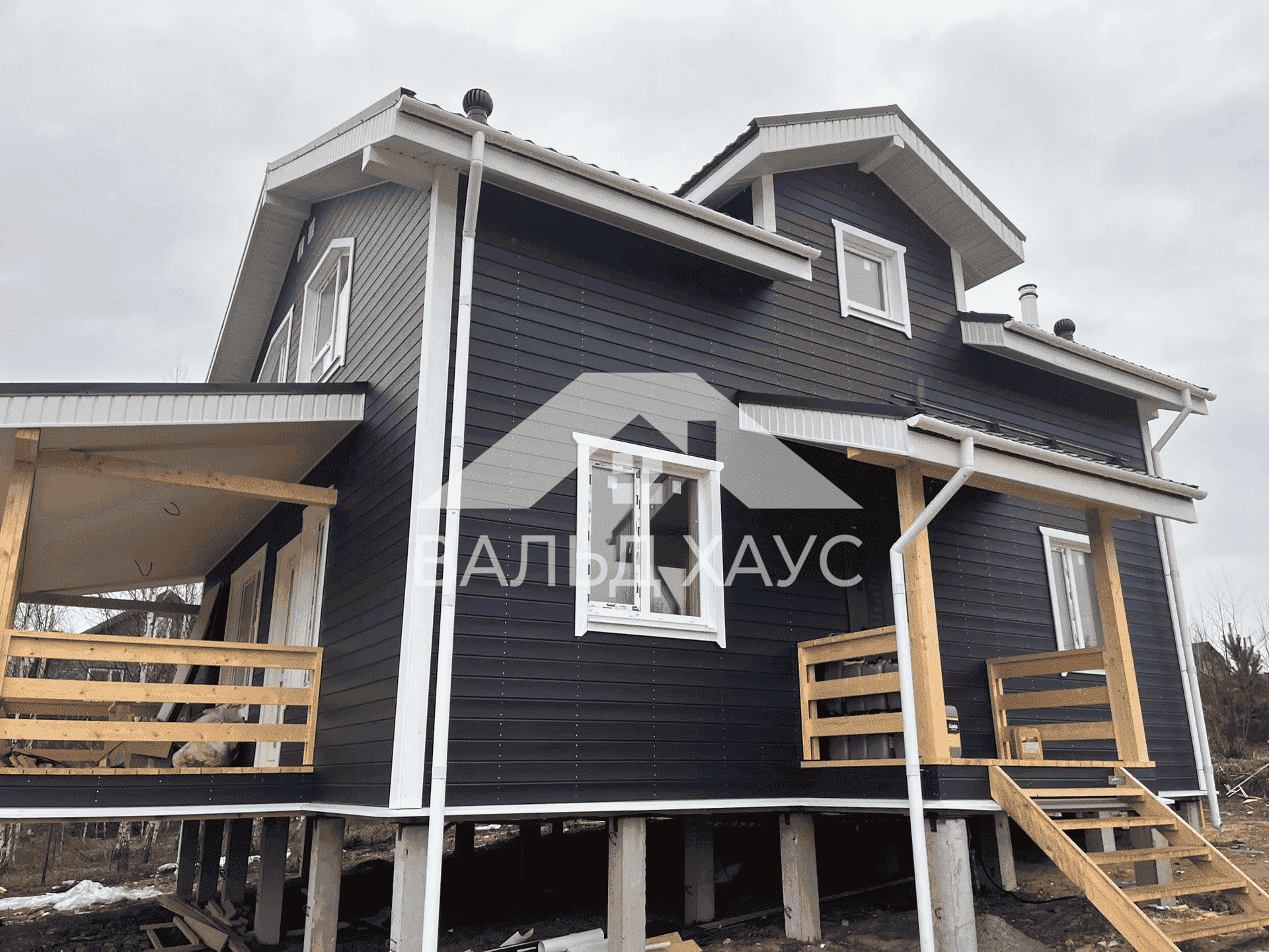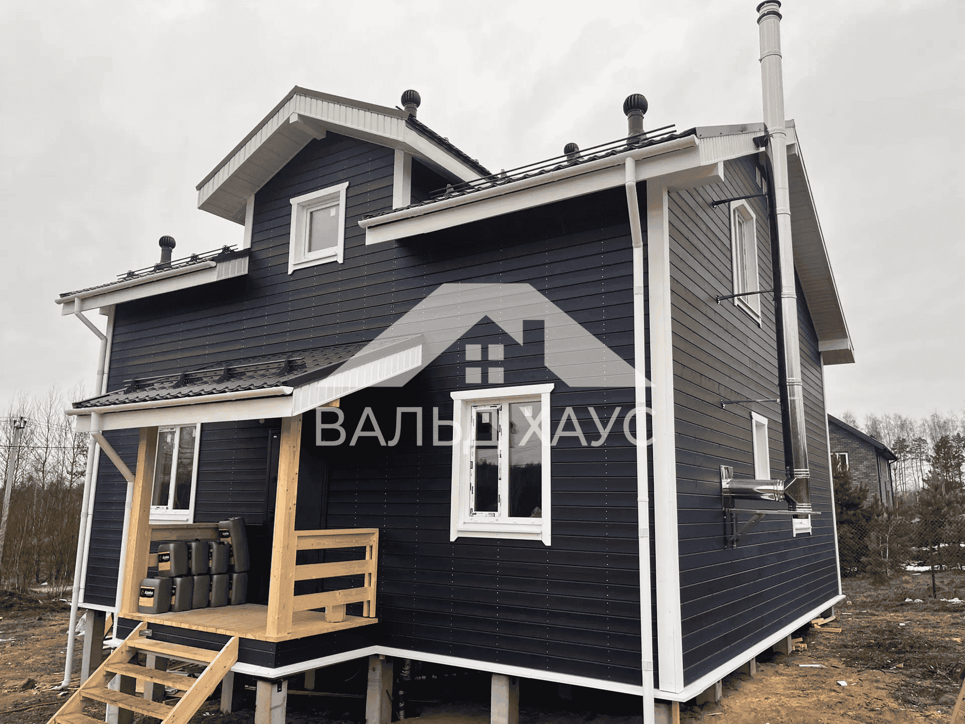 Фундамент выбран железобетонные забивные сваи, наружная отделка Имитация бруса с покраской - был выбран красивый глубокий синий цвет и белые добры: обналичка окон, отделка углов, подшив свесов кровли. Покрытие кровли металлочерепица цвета Ral 7024.